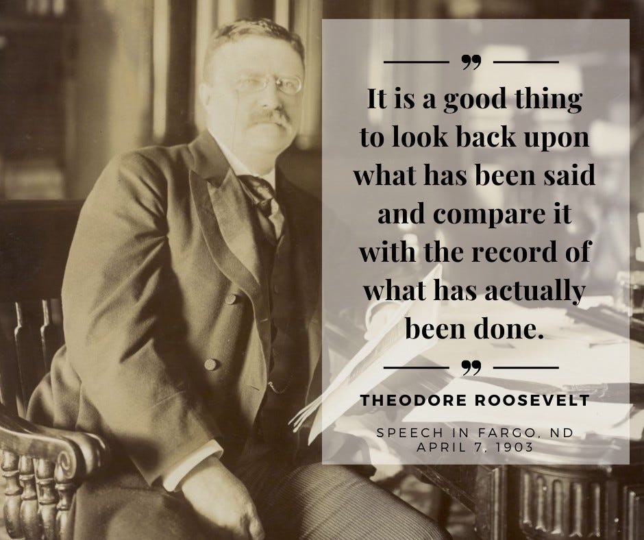 “It is a good thing to look back upon what has been said and compare it to what has actually been done,” said the president. “If promises are violated, if plighted word is not kept, then those who have failed in their duty should be held up to reprobation. If, on the other hand, the promises have been substantially made good; if the achievement has kept pace and more than kept pace with the prophesy, then they who made the one and are responsible for the other are entitled of just right to claim the credit which attaches to those who serve the Nation well.”