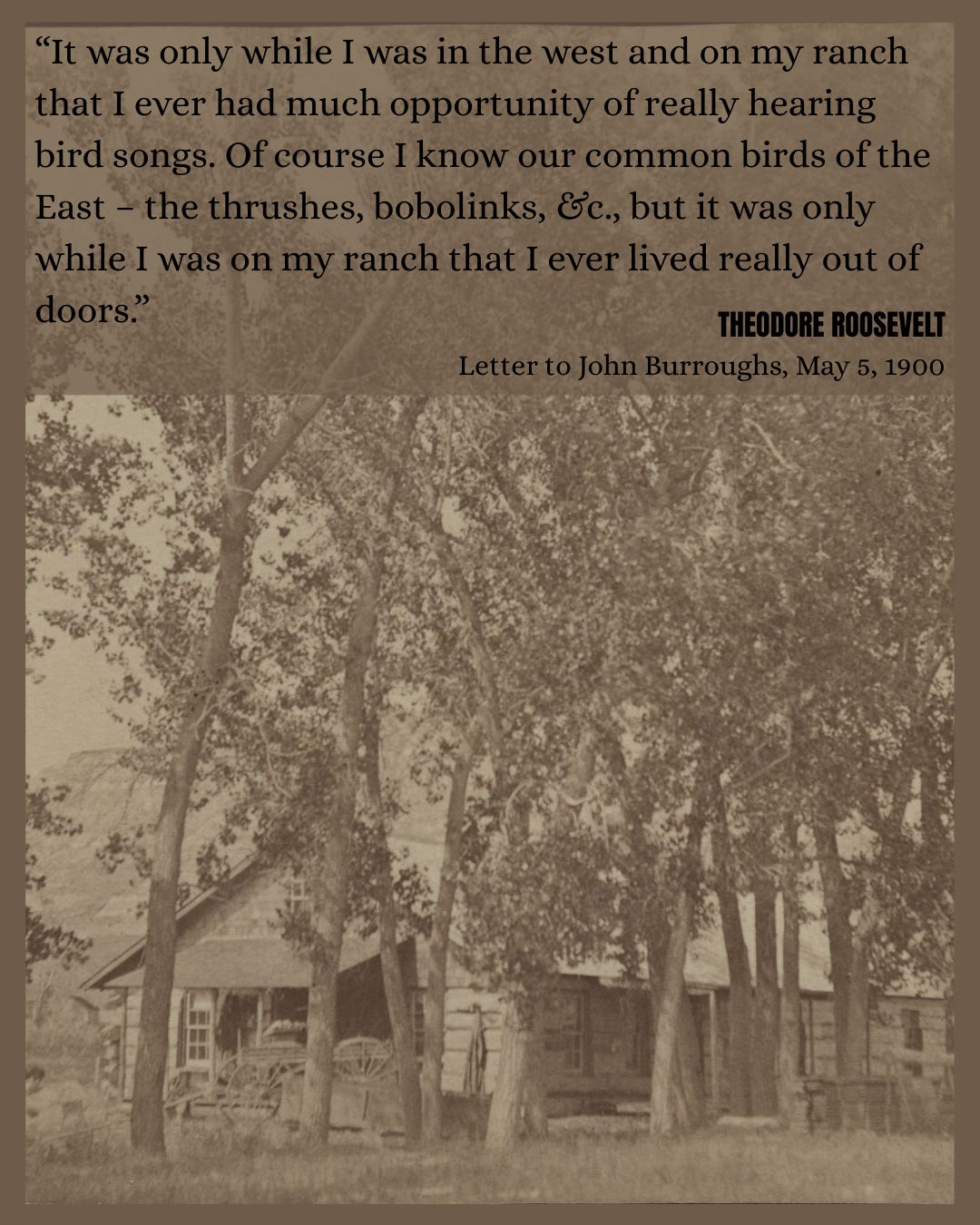 One would think that Roosevelt would have affirmed that he spent much time living outside and hearing bird songs on the East Coast. However, according to today’s Wednesday Wisdom, as Roosevelt wrote in a 1900 letter to his friend, John Burroughs, it was only on his ranch that he “really” heard bird songs and “lived really out of doors.”